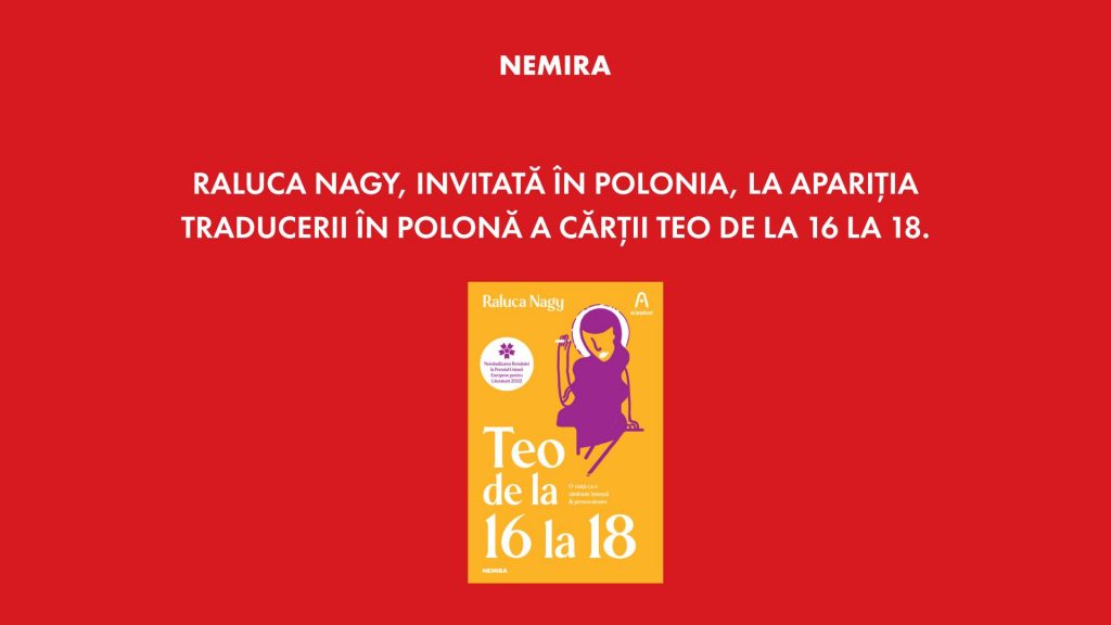Imprintul n’autor al editurii Nemira anunță publicarea primei traduceri din limba română a romanului „Teo de la 16 la 18” (2021), de Raluca Nagy, apărut recent în Polonia la Editura Pauză (Wydawnictwo Pauza), în traducerea Olgăi Bartosiewicz-Nikolaev. De altfel, autoarea a fost invitată la cea de-a XIV-a ediție a Festivalului Sopot Literar, unde România are statutul de țară invitată, și va participa, în perioada 21-24 august 2025, pentru a lansa traducerea în polonă a cărții sale.